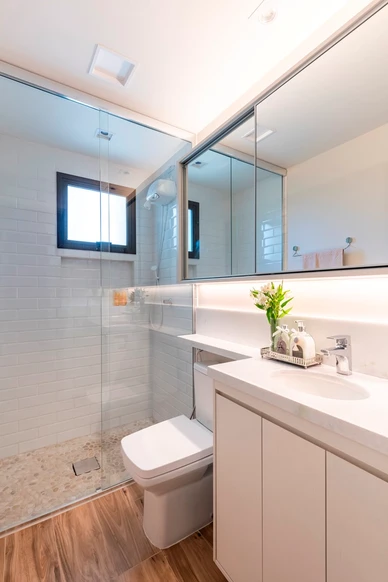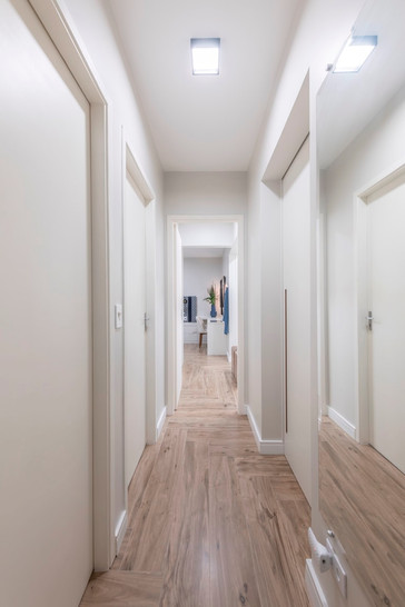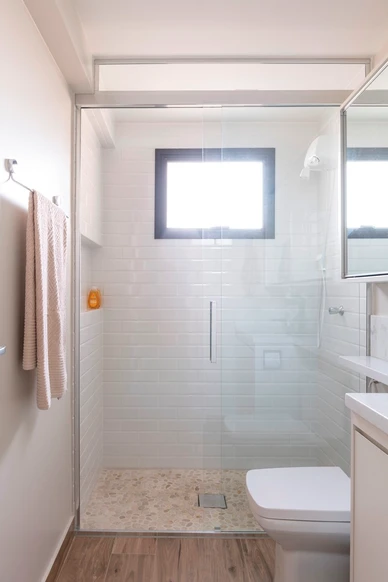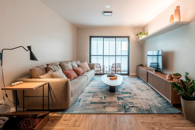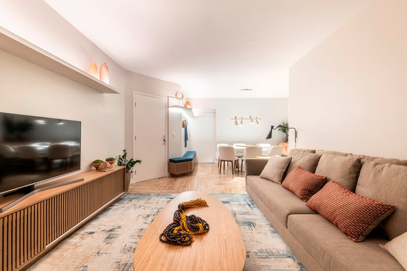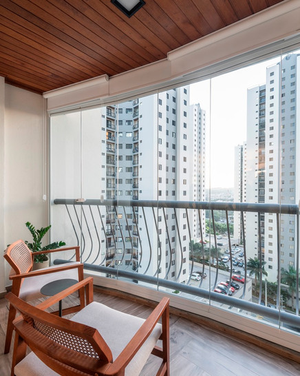 A chapelaria que abraça a parede entre as portas social e de serviço trouxe uma confortável solução para atender os hábitos da família.