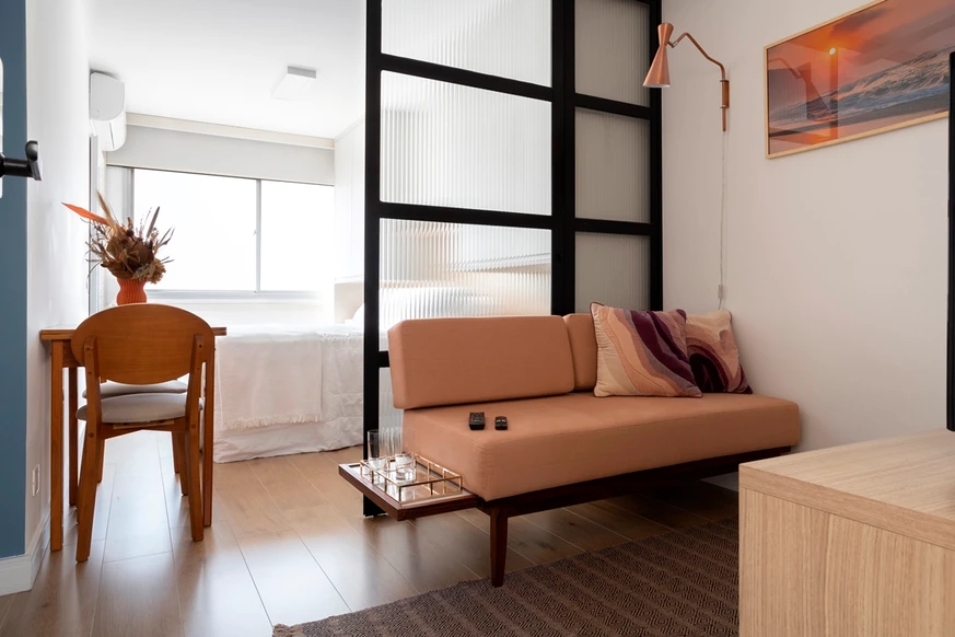Pequenos espaços exigem grandes soluções e neste apartamento poupamos espaço com uma divisória de serralheria que além de trazer privacidade ainda favoreceu a entrada de luz natural nos 2 ambientes!